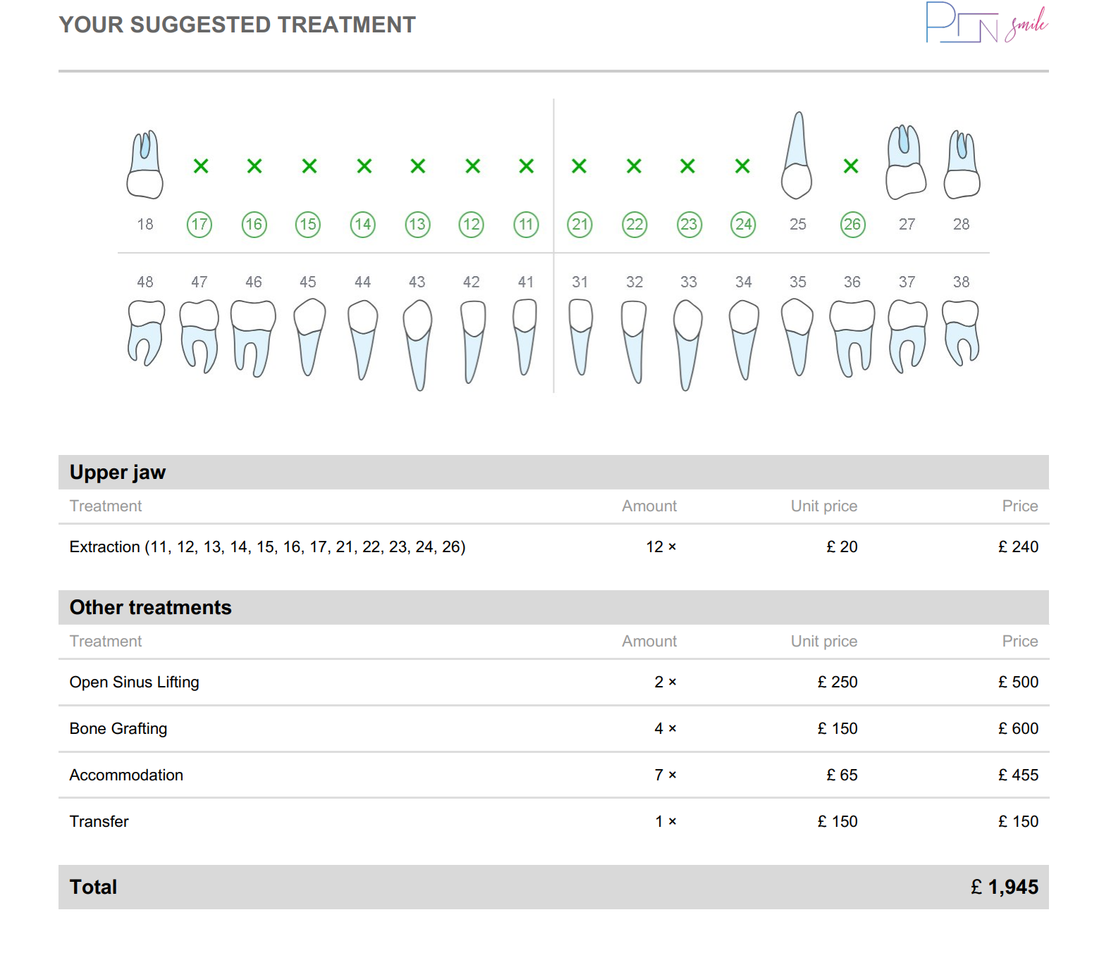 This included bone grafts, and sinus lifts (which I had not yet had), as well as hotel charges and transfer fees.